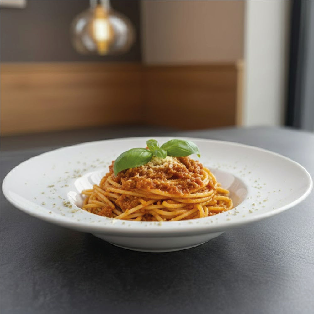Spaghetti mit Rinderhackfleisch und Tomaten, serviert mit Parmesan Käse.